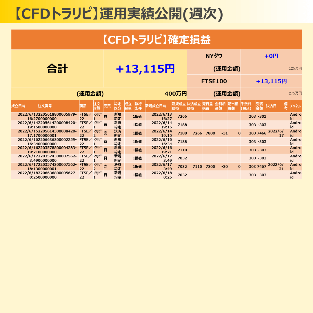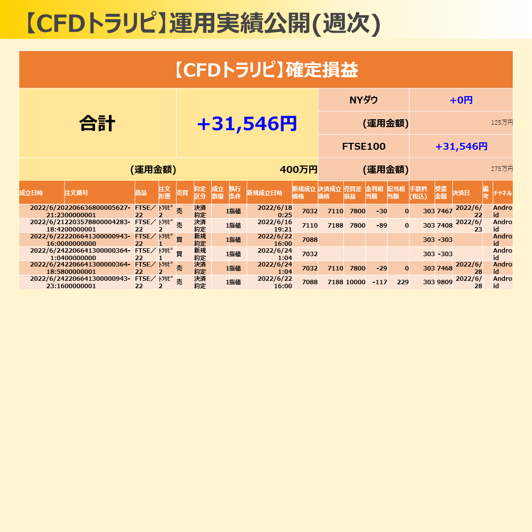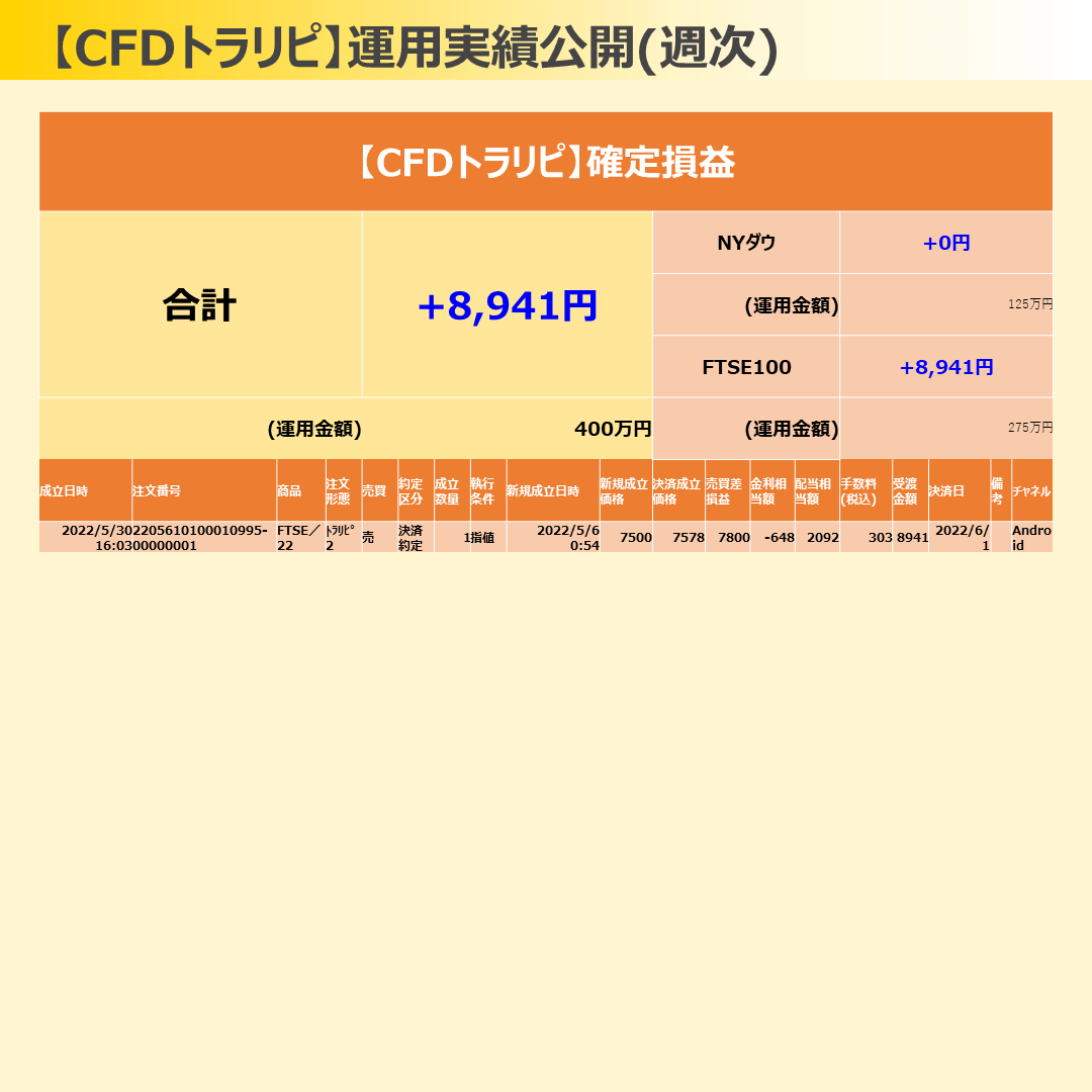 CFDトラリピは、FTSE100ちゃんが4決済!